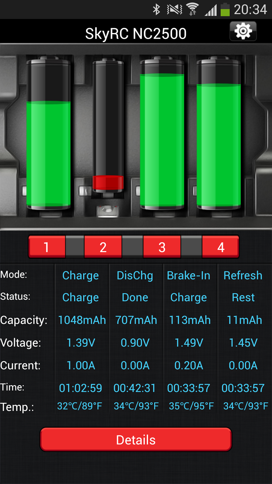 Justo en la parte central tenemos otra ilustración que simula la botonera central del NC2500, con cuatro botones numerados que corresponden a cada una de las bahías de carga. Al pulsar sobre cualquiera de ellos la aplicación nos muestra un cuadro de dialogo (Settings) en el cual podremos interactuar con el cargador, ordenando que tipo de función queremos hacer en dicha bahía.