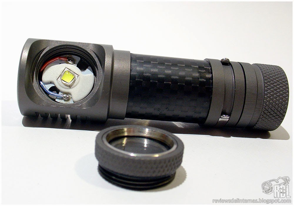 El cuerpo de la linterna cuenta con una camisa de fibra de carbono. Este añadido es simplemente un detalle estético, ya que no se me ocurre ningún tipo de característica funcional que este material pueda aportar a la linterna que no lo haga el aluminio. Aun así, he de reconocer que este tipo de compuesto, para alguien como yo a quien le gusta y sigue la F1 desde hace muchos años, tiene un encanto especial.
