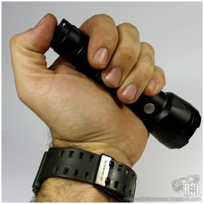 Es aspecto externo de la linterna es similar al de multitud de linternas de acabado “táctico”, con unas medidas muy compactas, con una óptica de 45mm y un largo total de 144mm.