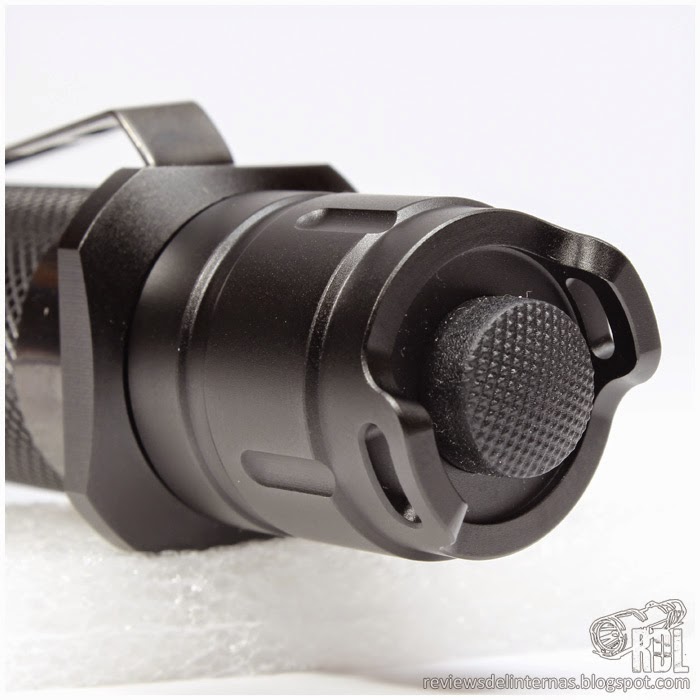 La cabeza de la linterna cuenta con acabado liso, con unos discretos rebajes laterales que evitarían que la linterna rodase si prescindiésemos del “cigar grip” instalado entre el tailcap y el tubo. El bisel está ligeramente almenado, y es también de aluminio.