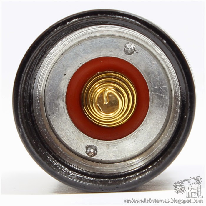 En el exterior encontramos un pulsador lateral, responsable del cambio de modos, rodeado a ambos lados de unas discretas aletas disipadoras. En el interior, encontramos el driver, que cuenta con un muelle para el contacto con el polo positivo de la batería, por lo que esta linterna admite button y flat tops sin problema.