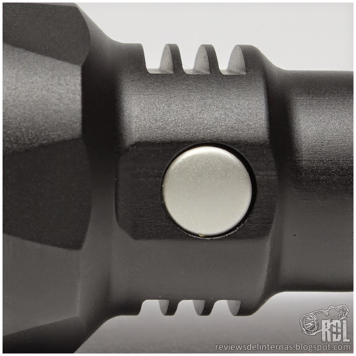El tailcap de la linterna cuenta con dos almenas que rodean el interruptor principal, ambas perforadas para pasar por ellas la correa muñequera. Rayus a prescindido del clásico knurling en el tailcap, optando por unas pistas en sentido latitudinal, que aunque no resultan tan efectivas como la solución clásica facilitan el agarre de la pieza a la hora de desenroscarla para el cambio de baterías. El interruptor forward tiene un tacto excelente, con una activación momentánea a aproximadamente el 50% de su recorrido antes de llegar al click.