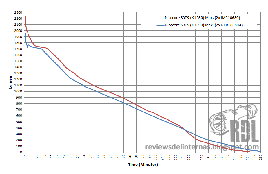 Esta nueva familia de emisores CREE necesita de unas baterías capaces de entregar de forma continua grandes corrientes, y por ello he vuelto a realizar el test en esfera para el máximo rendimiento tanto con baterías IMR como con las habituales NCR.