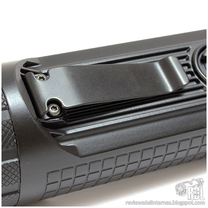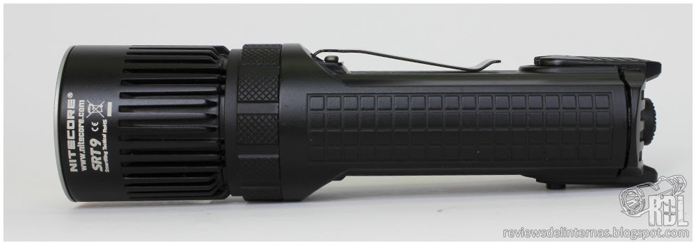 La SRT9 cuenta con un clip atornillado situado de en lateral de la linterna. La tensión del clip es media-alta. En el lado opuesto al clip encontramos un indicador LED de color azul, que sirve tanto como localizador como avisador de bajo voltaje.