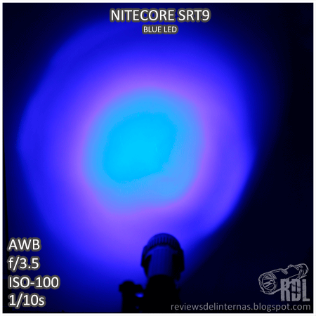 La proyección de la luz auxiliar de color es distinta. Aunque Nitecore ha utilizado un LED para cada una de las aplicaciones (en lugar de LEDs RGB como en la SRT7), la proyección es bastante asimétrica debido a la luz rebotada de forma desigual por el reflector principal del XHP50.