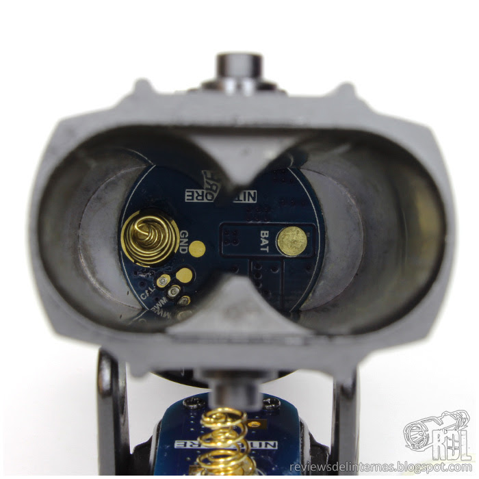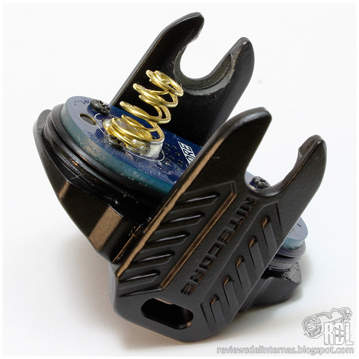 El sistema de cierre del tailcap es bastante novedoso. En lugar de utilizar el clásico sistema de cierre roscado, Nitecore ha implementado un sistema de cierre "a presión", en el que el tailcap se sujeta a la linterna mediante dos abrazaderas situadas a ambos extremos.