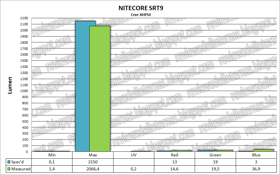 Aunque en la documentación de la linterna se hace referencia a la salida mínima en 0.1 lumen, tras mis propios test la salida mínima que consigo estabilizar antes de que la linterna llegue a entrar en modo standby es de 1.4 lumen. No es excesivamente alta, pero ciertamente 0.1 lumen habría sido mucho más interesante. El recorrido del anillo en su zona de ajuste variable es muy bueno, con una progresión muy equilibrada. Las mediciones de los colores están a modo anecdótico, ya que el fotosensor de mi esfera integradora no garantiza fiabilidad alguna en luz no visible.