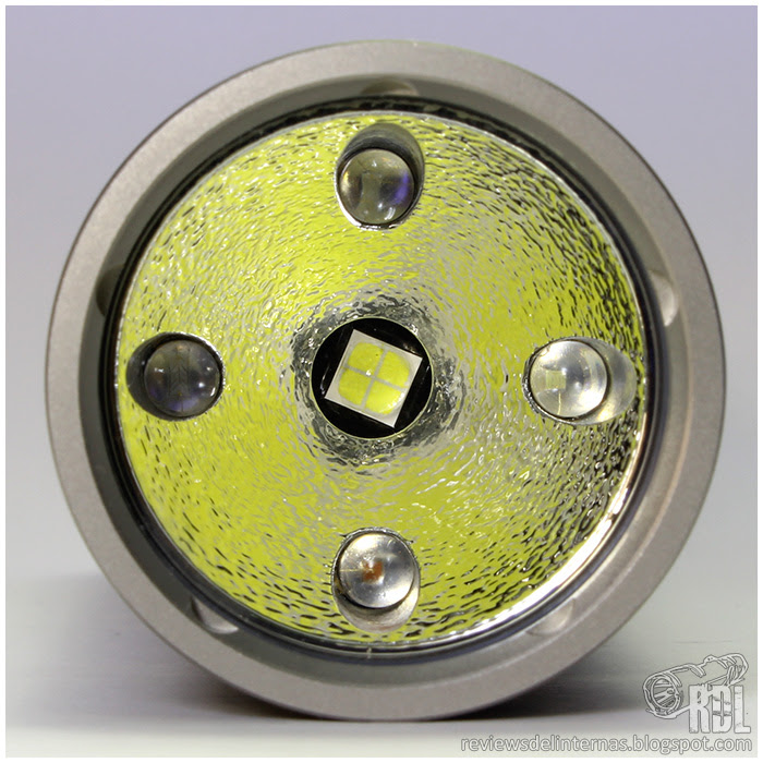 La óptica está compuesta por un bisel de acero liso, lente de cristal con tratamiento anti-reflejos, reflector OP con cuatro orificios situados aproximadamente entre si a 90º para la luz de color auxiliar y en CREE XHP50 perfectamente colocado en el centro.