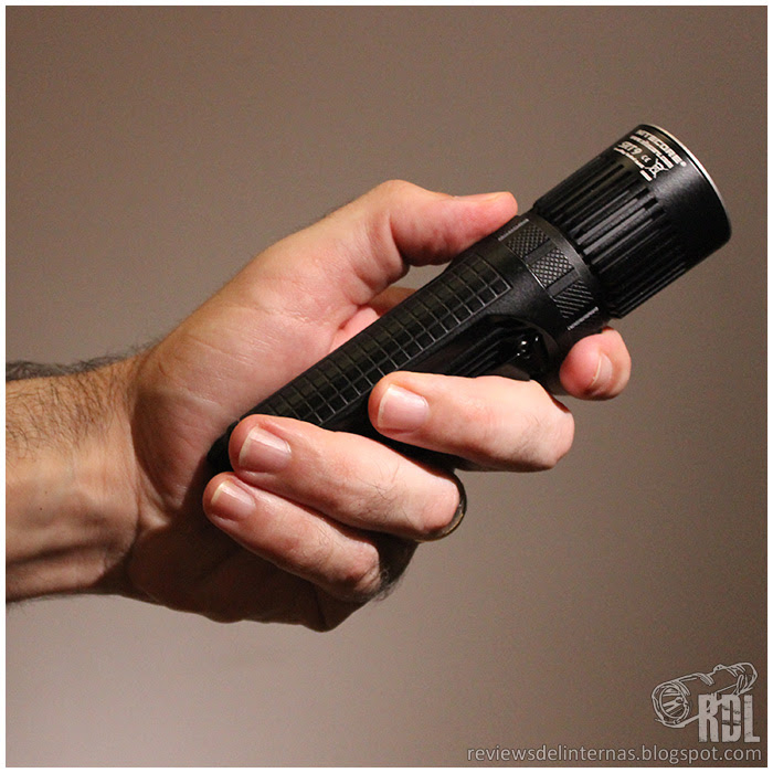 El cuerpo de la linterna muestra una textura de aletas disipadoras en su parte central, mientras que en los extremos está acabado con una textura de cuadrados.
