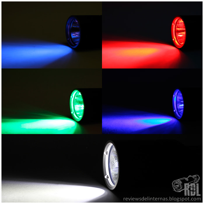 - Luz auxiliar UV y de color: Volvamos al punto de Standby, y en lugar de girar el anillo a derechas, lo hacemos ahora a izquierdas. El primer reten que encontramos pertenece a la luz UV, el siguiente a la luz roja, seguido de la verde y un retén más nos lleva a la luz azul. Esta luz multicolor producida por los LEDs integrados en el reflector ofrece un rendimiento no comparable al del XHP50. Nitecore ha utilizado un LED para cada color, lo que reduce considerablemente los artefactos generados, pero no los elimina por completo.