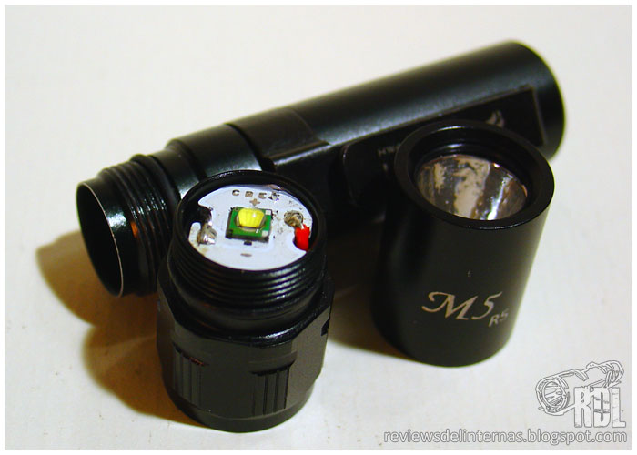 La siguiente parte es el tramo intermedio, donde encontramos el driver y el XP-G R5. Todo esto parece estar montado directamente sobre el aluminio del chasis, lo que mejora notablemente la disipación si la comparamos con otras soluciones con distintas piezas de diferentes materiales en las que el calor se ve obligado a saltar de una a la otra.