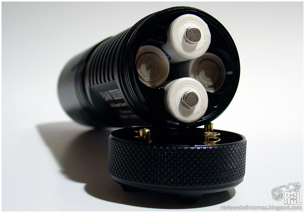 Las roscas, completamente anodizadas y de corte cuadrado, llegan ligeramente engrasadas y bien limpias. En el interior del tapón tenemos un disco que contiene los contactos para las baterías, con dos pivotes que se encargan de la correcta alineación de estos con las baterías.
