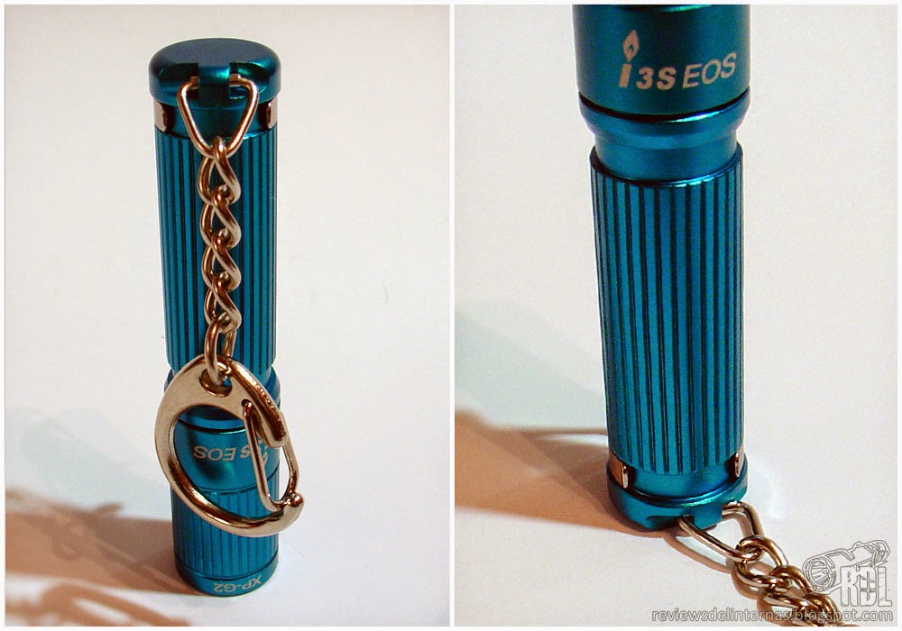 En el tailcap tenemos también un enganche para llavero, mecanizado en un lateral que no impide colocar la linterna tailstanding. Tiene instalada una pequeña cadena y un mosquetón aparentemente no desmontables.
