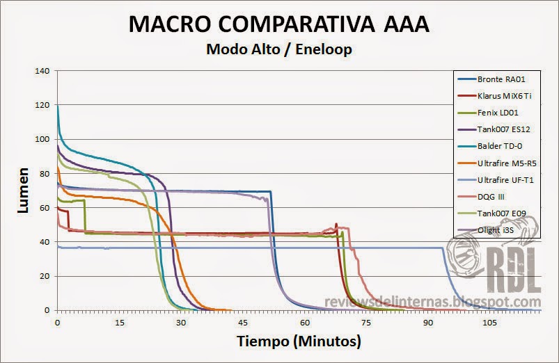 Añadida a la macro comparativa AAA, podemos ver que su rendimiento máximo está casi a la altura de la Bronte RA01, tanto en regulación, salida y tiempo. En este aspecto, Olight ha hecho un gran trabajo.