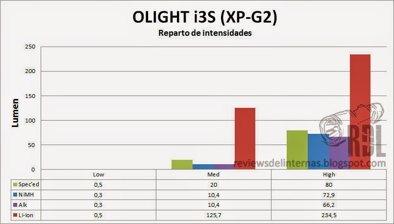 También observareis que la i3S funciona con Li-Ion, dándonos la nada despreciable cifra de 235LM a los treinta segundos de su encendido en su modo alto.