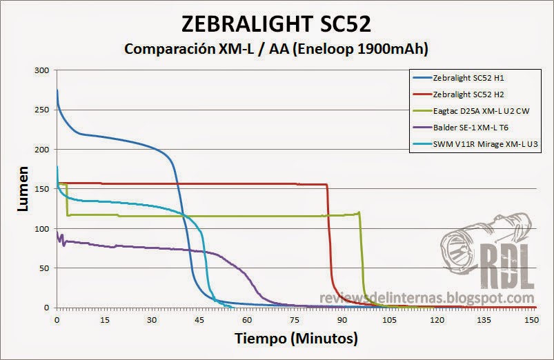En mi cutrelux la Zebra no me da los 500 lumens que anuncian, ademas los mantiene muy poco tiempo pero eso ya lo dicen, y si compararo las potencias o lumens con el mismo cutrelux mio las otras si superan los 500 lumens que anuncian y en las fotos tambien se aprecia que la SC52 da menos luz que las otras a excepcion de la MT1A que con litio me da sobre 350, eso me da a pensar que mi invento para medir lumens es rudo pero creo no se aleja demasiado de la realidad, ya que si saca o pone de mas lo haria similar para todas.